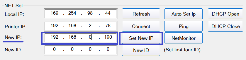 Принтер издаст звуковой сигнал и автоматически перезагрузится. Вы услышите звуки отключения и подключения устройства к компьютеру. Окна Net Settings и Advanced, которые открывали для настройки параметров сети, закройте.Теперь необходимо снова ввести заданный для принтера IP в поле New IP и нажать на кнопку Set New IP. Принтер вновь издаст сигнал и перезагрузится.