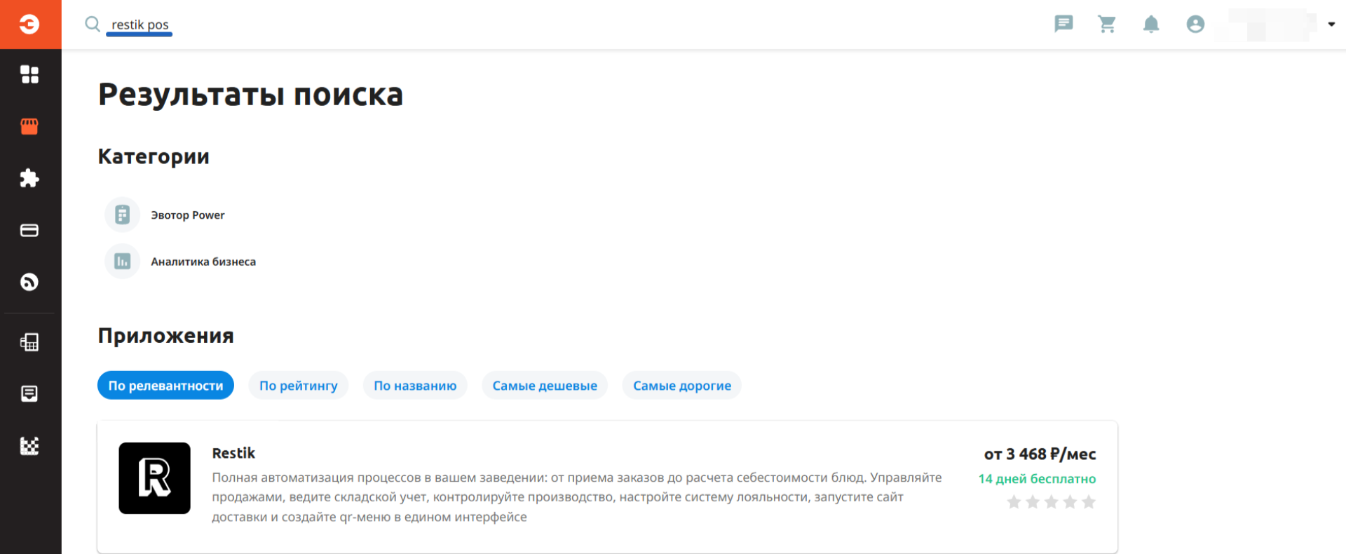 1. Перейдите по ссылке на страницу приложения Restik POS или найдите приложение в поиске Эвотор.Маркет по названию: