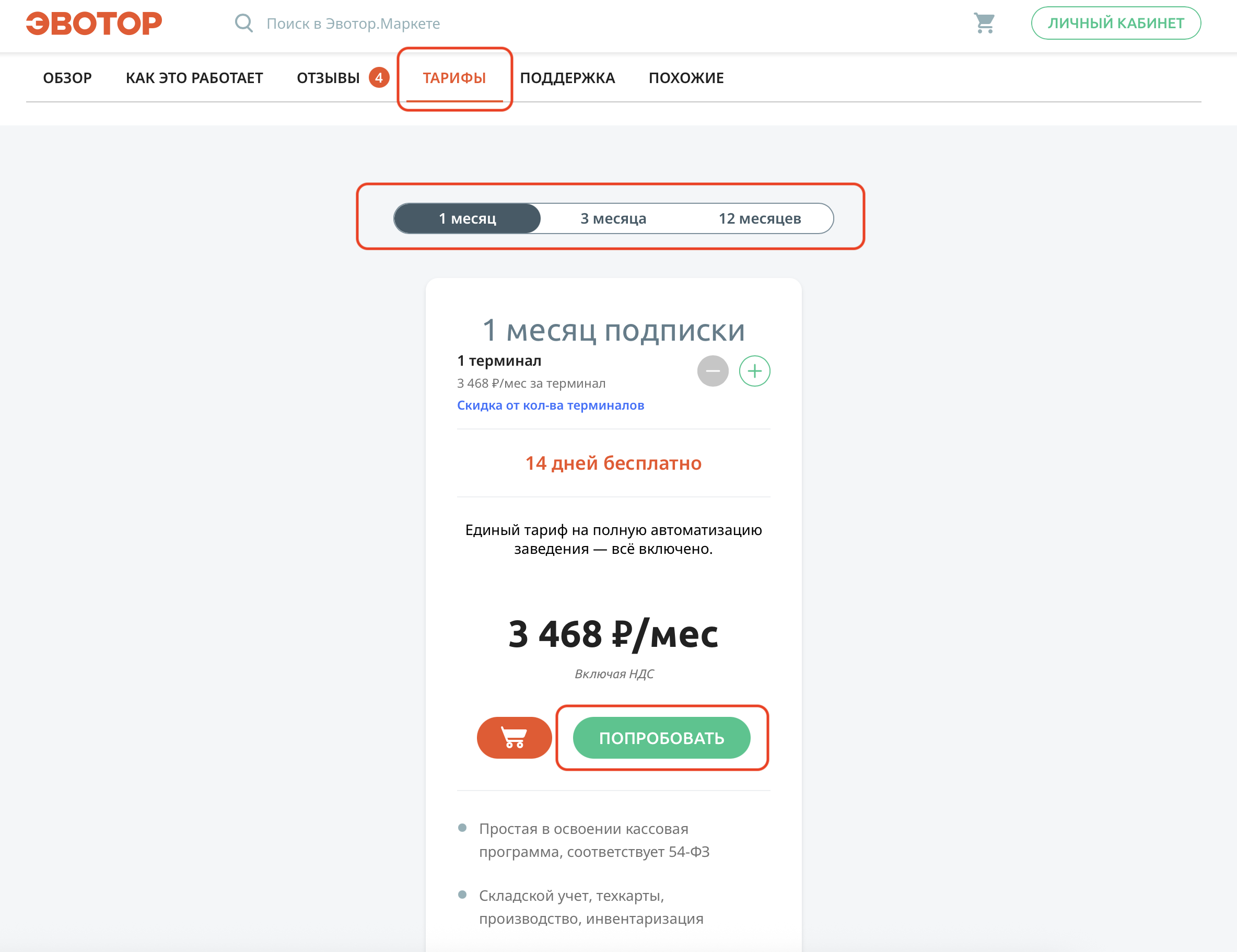 2. Откройте раздел «Тарифы», чтобы настроить количество терминалов для работы и выбрать подписку на месяц, 3 месяца или год. Нажмите на кнопку «Попробовать» для активации бесплатного периода: