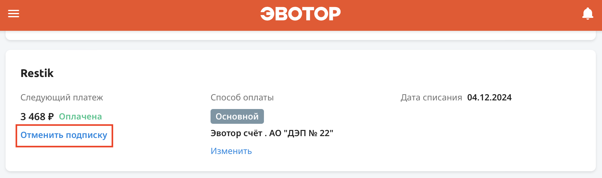 Отменить подписку Restik в Эвотор.Маркет можно двумя способами: