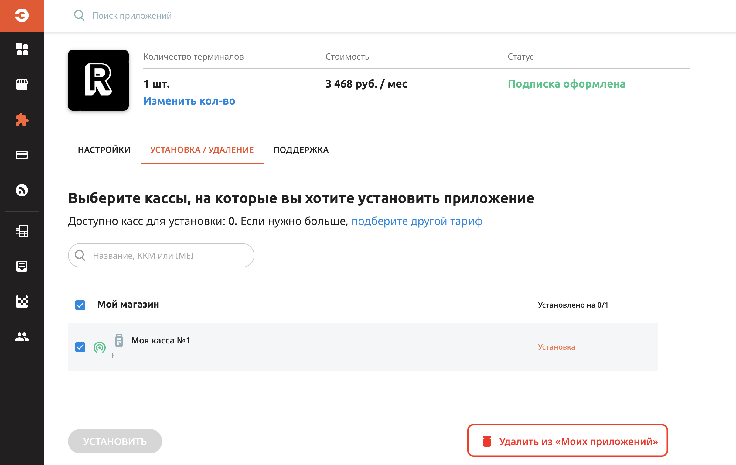 Перейдите на страницу приложения Restik POS в Эвотор.Маркет, во вкладку «Установка / Удаление», нажмите на кнопку «Удалить из «Моих приложений». После подтверждения приложение и все его данные будут удалены, будет отменена подписка, и с вас больше не будут списываться средства.Отменить подписку, не удаляя приложение.