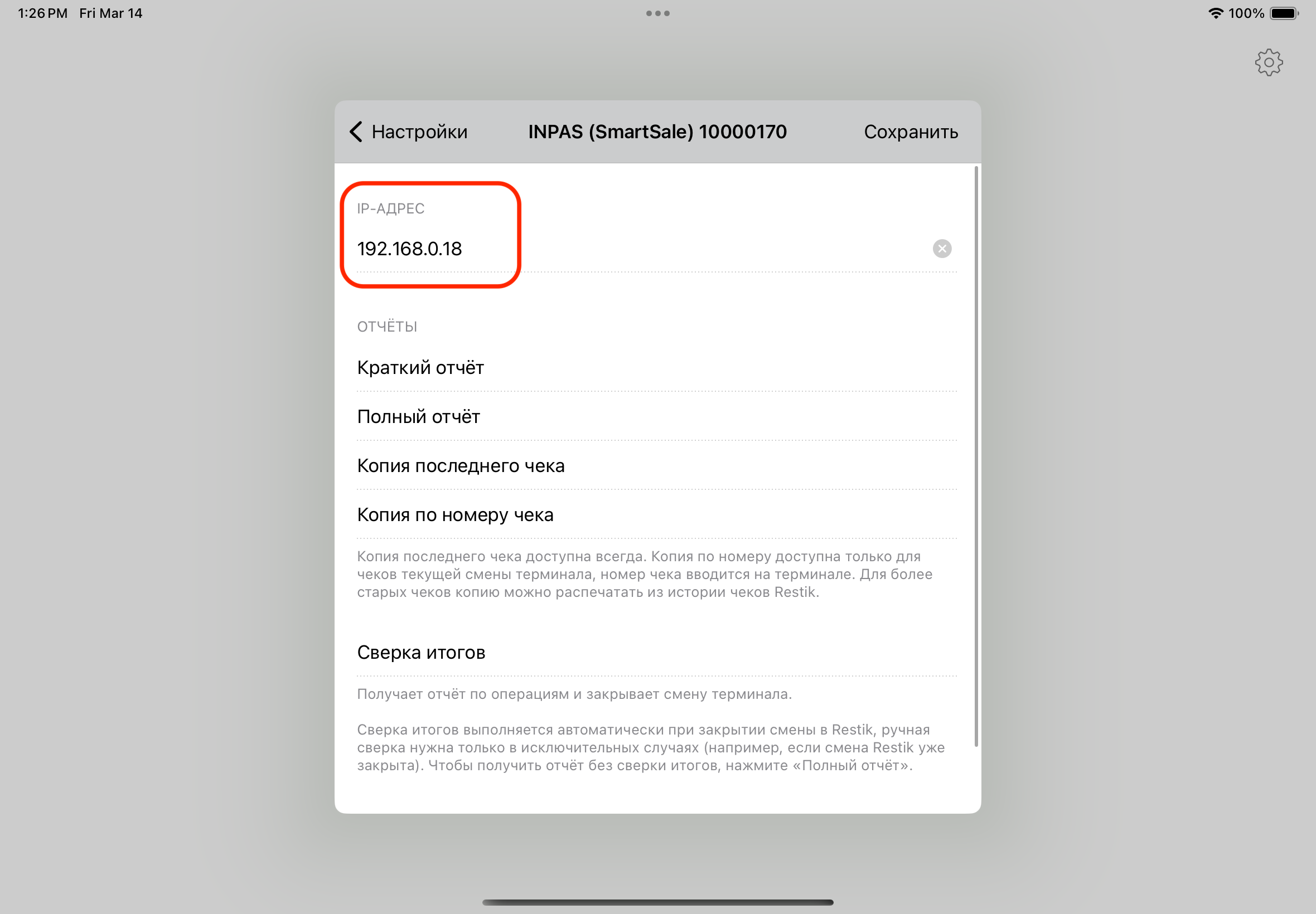 3) Убедитесь, что IP-адрес, который вам сообщил инженер банка, совпадает с IP-адресом в настройках Restik POS: