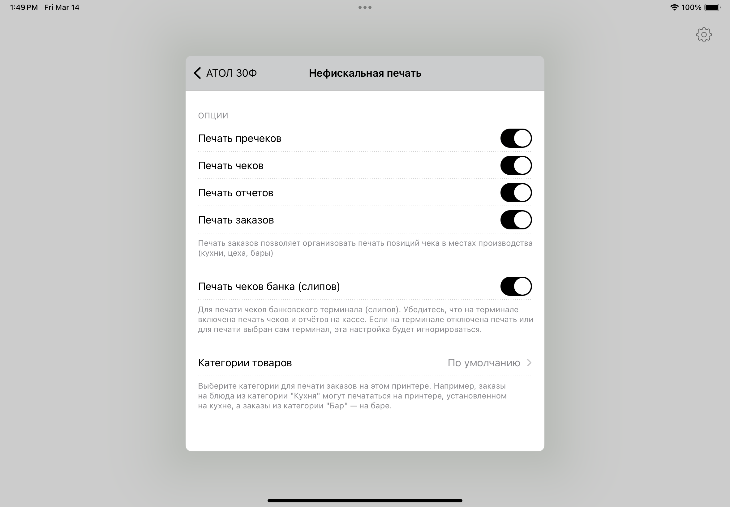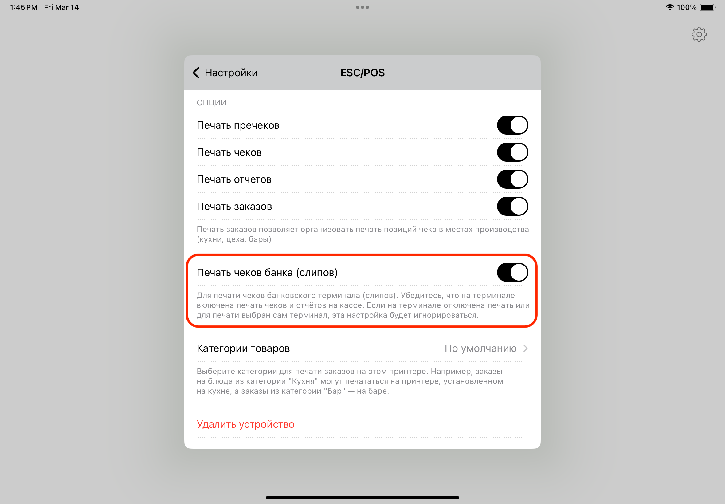 Вы можете печатать банковские чеки (слипы) и отчёты, если у вас есть подключенный принтер чеков или онлайн-касса. Есть несколько параметров печати, которые можно настроить: