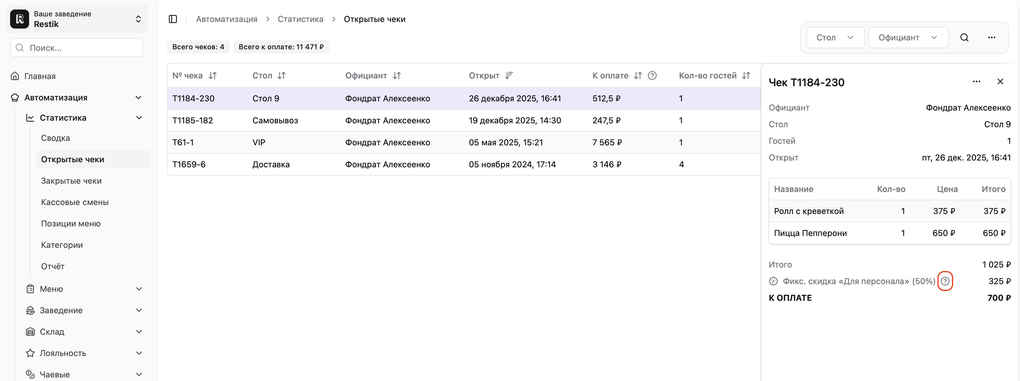 Какая именно фиксированная скидка и в каком количестве была применена к чекам, можно посмотреть в разделе «Статистика — Закрытые чеки». Например, если у вас есть несколько фиксированных скидок: «Для персонала» и «Для VIP гостей».
