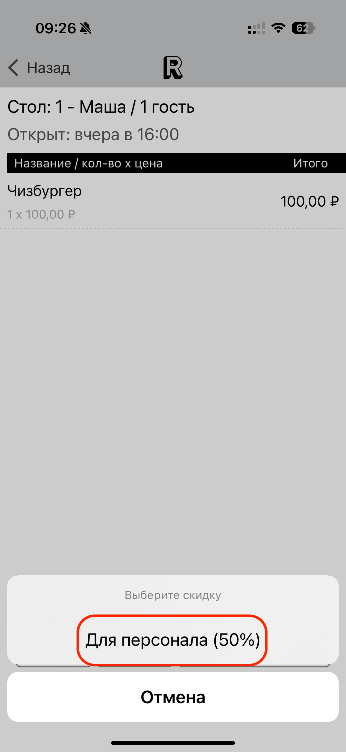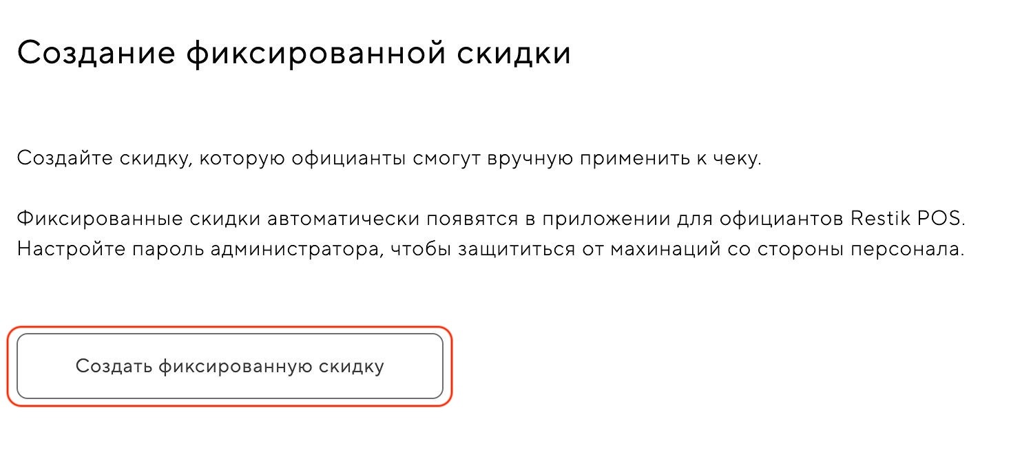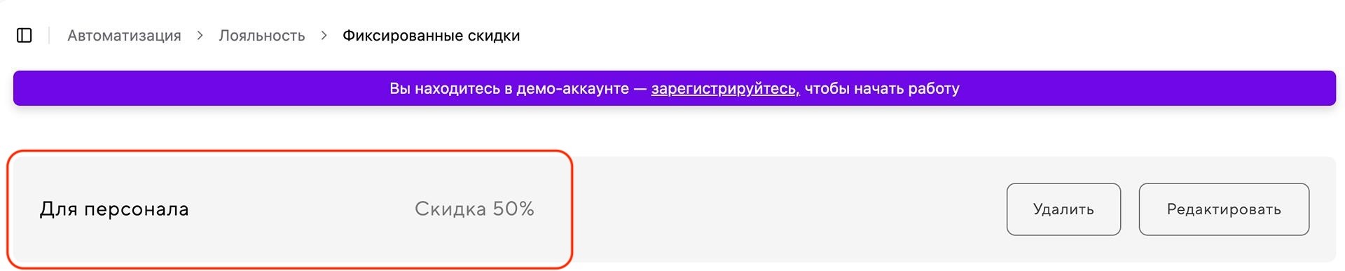 Фиксированные скидки нужны, если вы хотите сделать разовую скидку для гостя или сотрудников. Вам не нужно создавать программу лояльности и начислять бонусы. Вам просто нужна скидка здесь и сейчас — например, на питание персонала, для управляющих или на заказ на вынос.