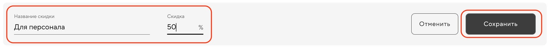3. Заполните поля «Название скидки» и «Скидка», в примере это скидка для персонала в 50%. Обязательно нажмите «Сохранить».
