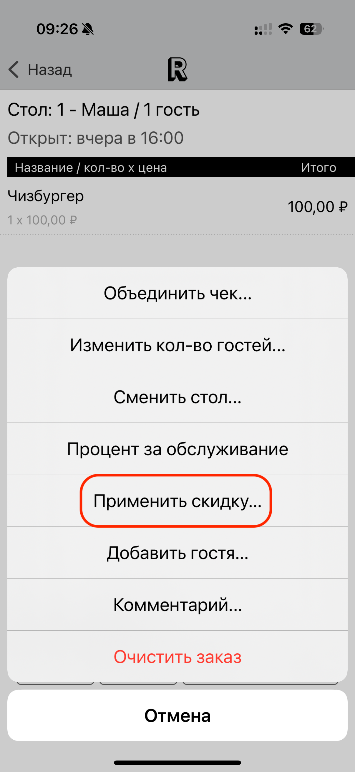 💡Если в приложении Restik POS вы не видите пункт «Применить скидку» или в списке нет созданной скидки — проверьте, что: скидка создана в панели администратора; синхронизация данных прошла успешно; вы авторизовались в нужном аккаунте Restik.