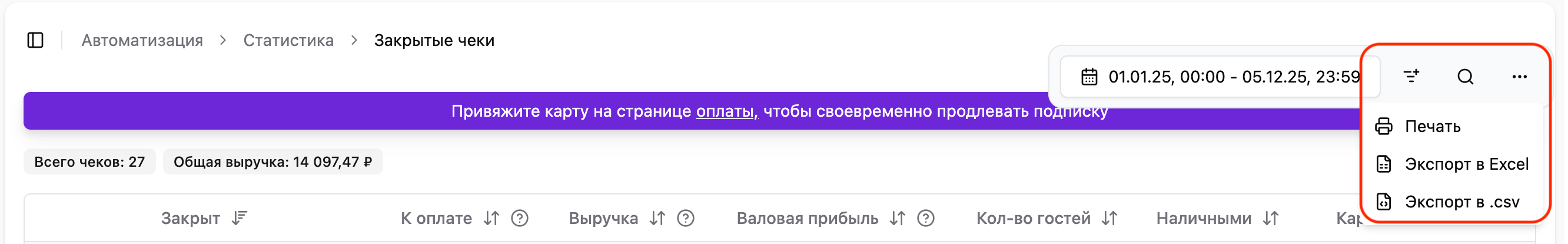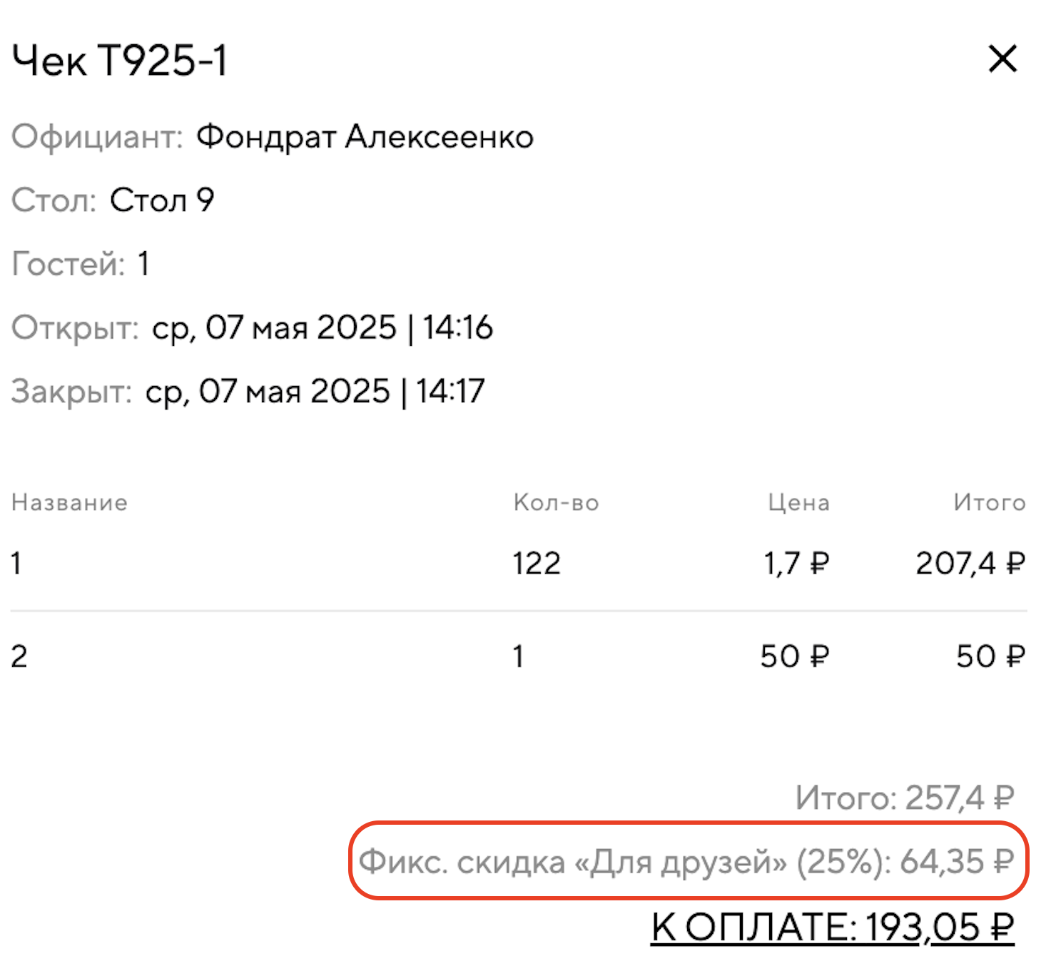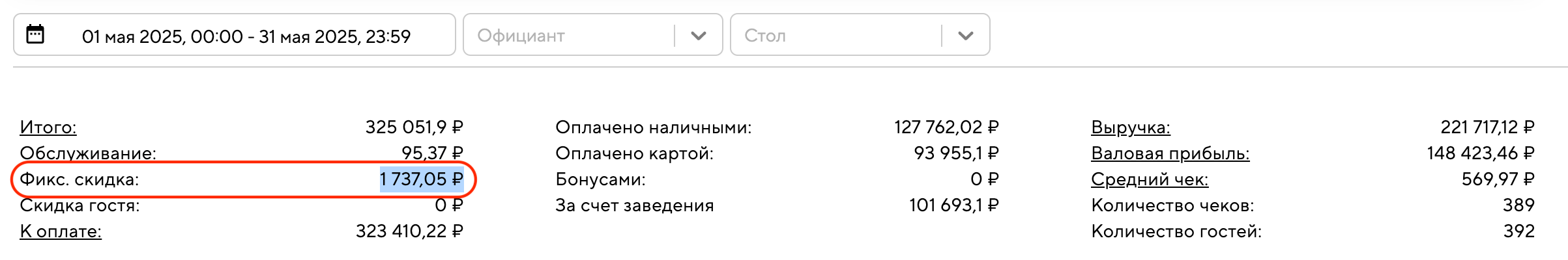 Какая именно фиксированная скидка и в каком количестве была применена к чекам, можно посмотреть в разделе «Статистика — Закрытые чеки». Например, если у вас есть несколько фиксированных скидок: «Для персонала» и «Для VIP гостей».