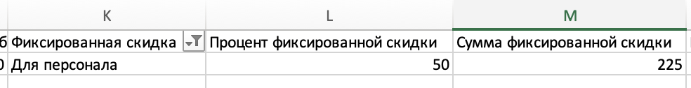 Например, можно отфильтровать данные в Excel. В таблице вы увидите название фиксированной скидки, процент скидки и итоговую сумму скидки по конкретному чеку. Также в выгрузке можно суммировать информацию по нужной скидке.