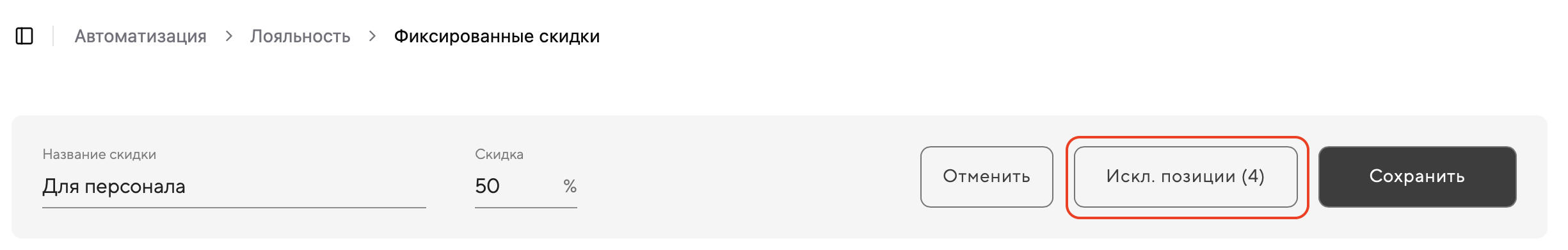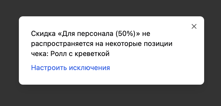 Для каждой фиксированной скидки можно настроить исключения — выбрать позиции меню, к которым эта скидка применяться не будет. Это удобно, если вы не хотите давать скидку на отдельные товары (например, алкоголь, табак, позиции по спец. цене и т. п.).