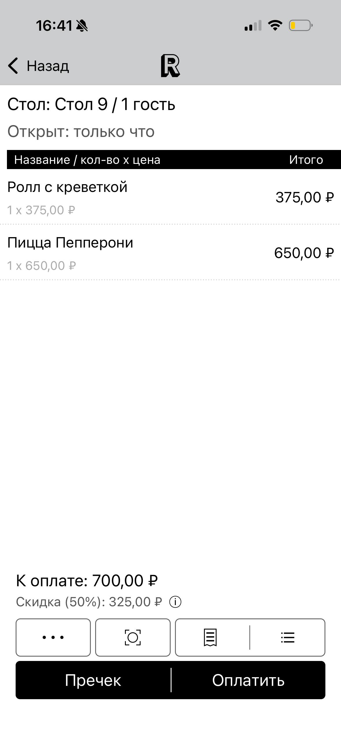 4. Скидка применится к чеку и отобразится в левом нижнем углу: