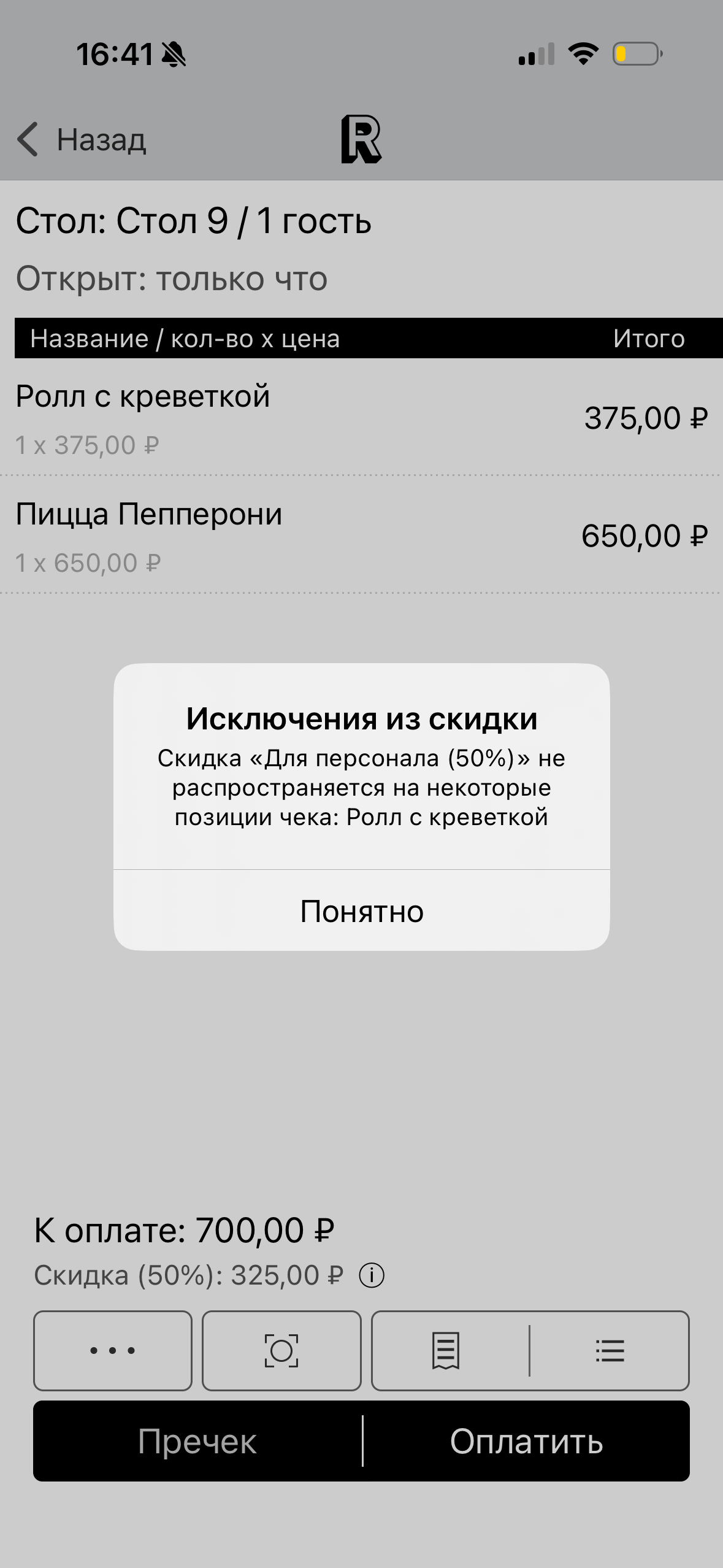 Если у фиксированной скидки есть исключения, в Restik POS в открытом чеке и в истории чеков рядом с строкой скидки появляется значок ⓘ (информация).