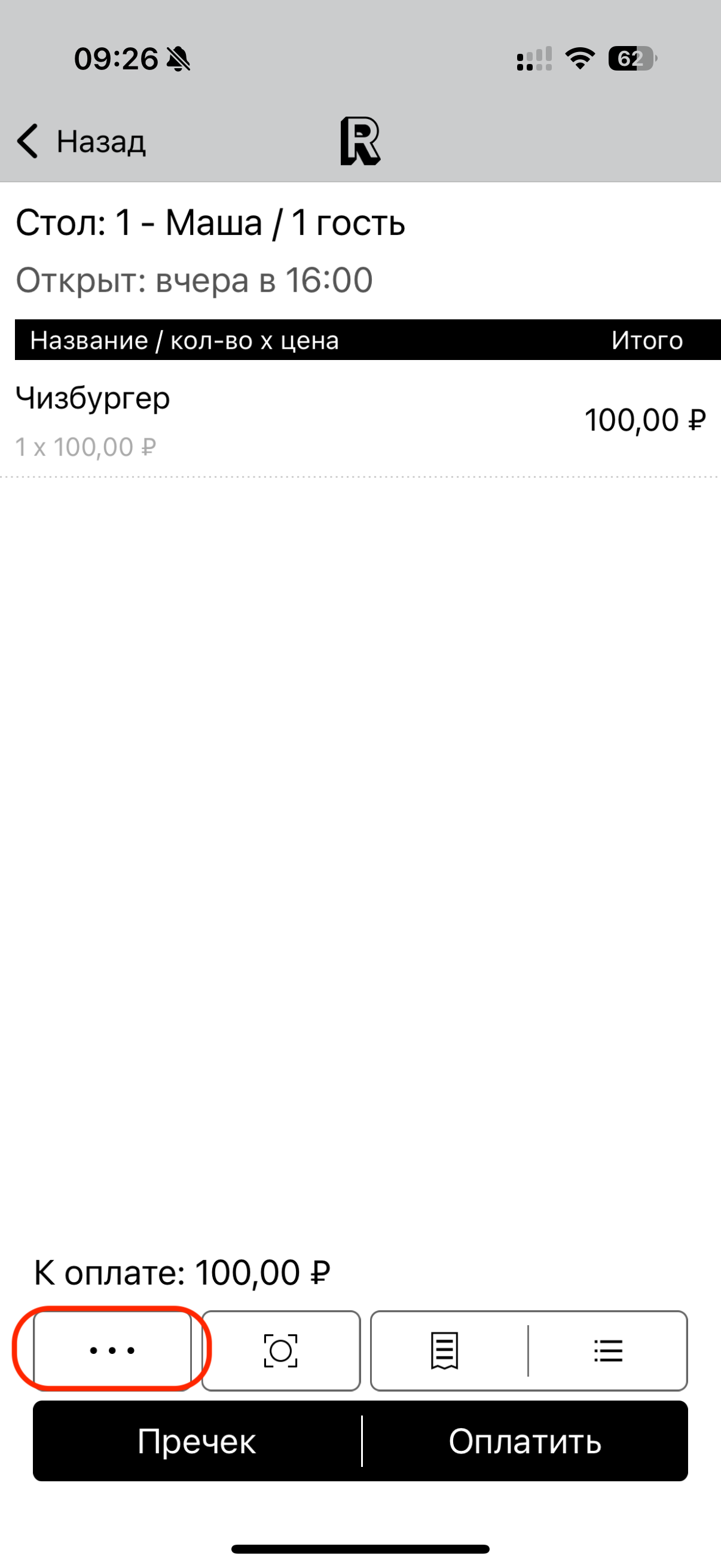 1. Зайдите в чек, затем на экране чека нажмите на три точки в левом нижнем углу.
