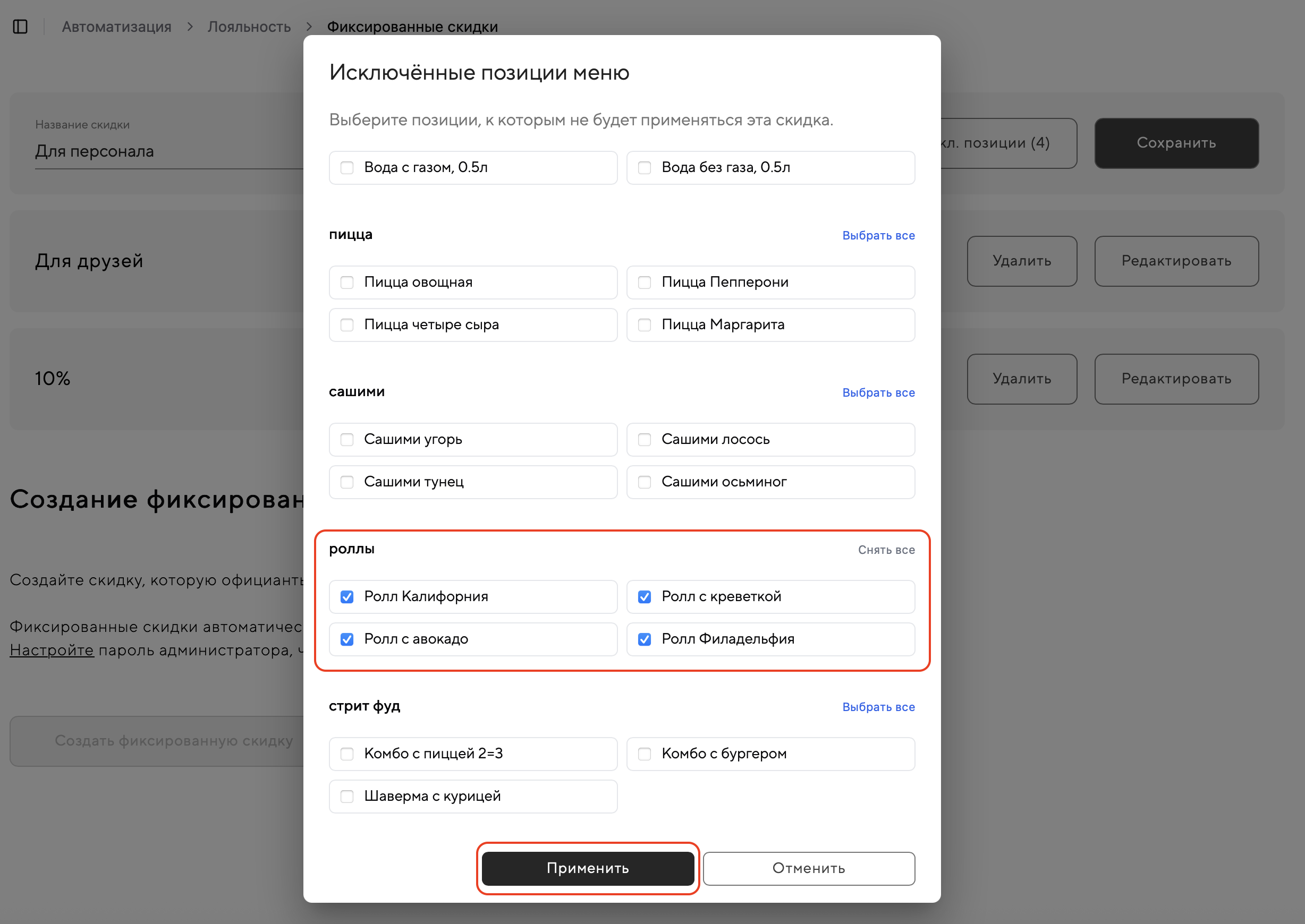 Выберите позиции меню, которые нужно исключить из этой скидки, и примените выбор: