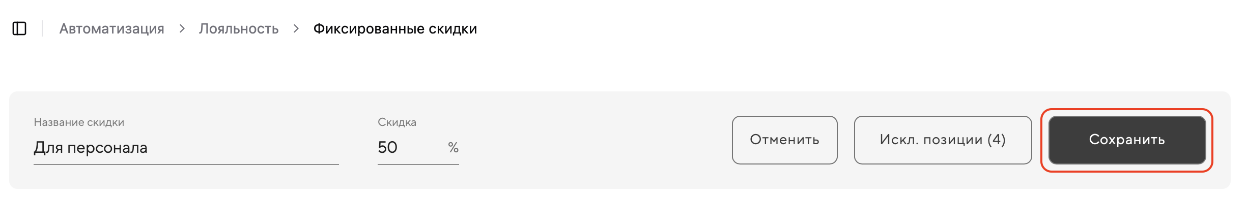 3. Заполните поля «Название скидки» и «Скидка», в примере это скидка для персонала в 50%. Обязательно нажмите «Сохранить».