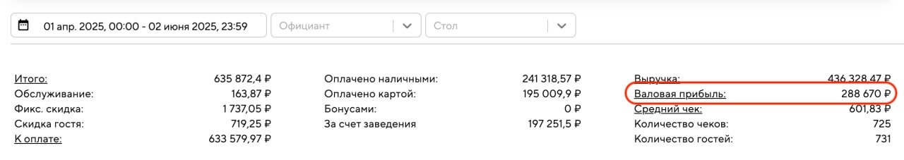 1. Показывает эффективность продаж. Если валовая прибыль высокая — значит, заведение хорошо зарабатывает на продаже позиций.