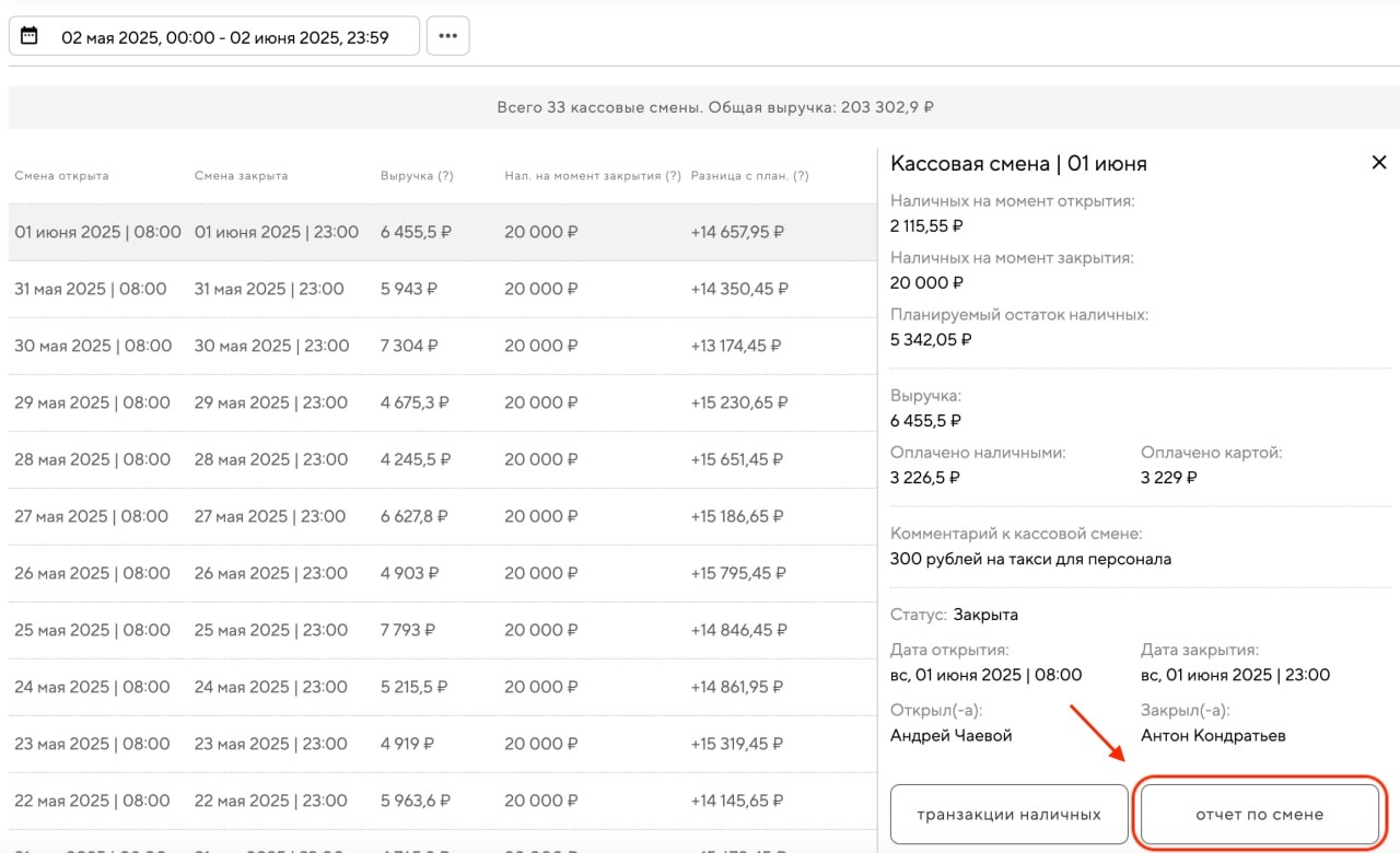 Раздел «Статистика — Кассовые смены». Выберите интересующую вас смену, нажмите на неё, затем — кнопку «отчет по смене»: