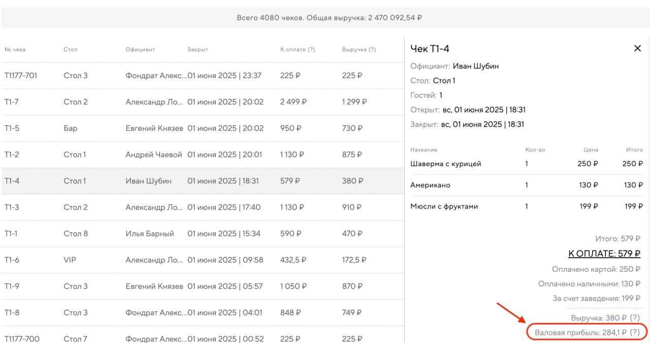 2. В закрытых чеках — можно увидеть валовую прибыль целиком по каждому конкретному чеку. Она считается как: выручка по чеку (наличные + карта) − суммарная себестоимость всех позиций в чеке.