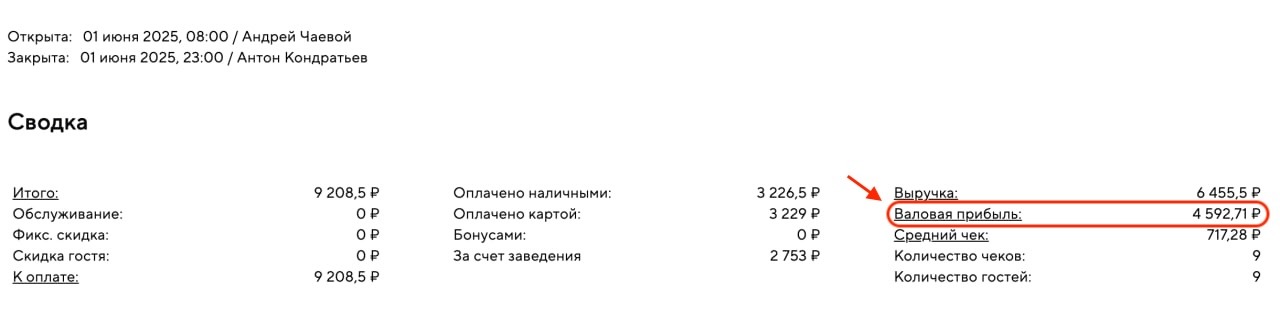 2. В закрытых чеках — можно увидеть валовую прибыль целиком по каждому конкретному чеку. Она считается как: выручка по чеку (наличные + карта) − суммарная себестоимость всех позиций в чеке.