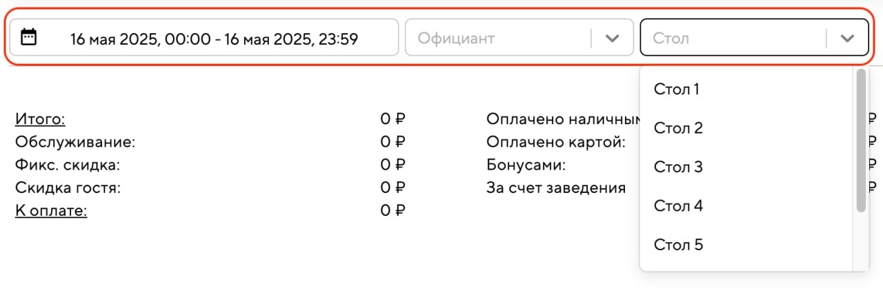 • В отчёте по закрытым чекам вы можете посмотреть все подробности по продажам на нужном столе. Выберите промежуток времени, нажмите «Показать все фильтры» и выберите стол: