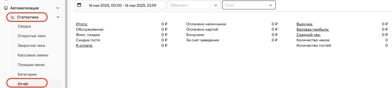 По умолчанию отображается общий отчёт за сегодняшний день. Выберите в фильтре стол «Предзаказ» и промежуток времени, который вы хотите проанализировать. Здесь отображаются выручка, валовая прибыль, сумма скидок и другие детали за выбранный временной период.