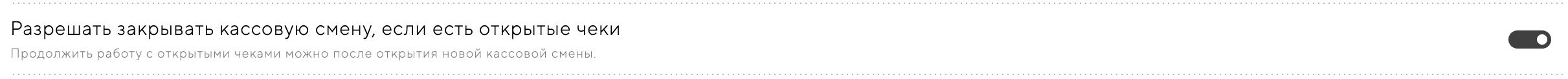 Включить функцию «Разрешать закрывать кассовую смену, если есть открытые чеки» можно по ссылке. Включите тумблер и сохраните изменения: