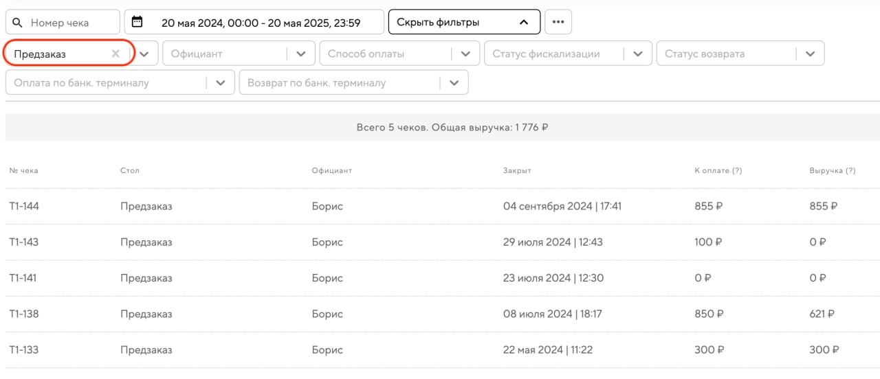 2. Если вы хотите посмотреть статистику по каждому отдельному предзаказу (чеку), откройте отчёт по закрытым чекам.