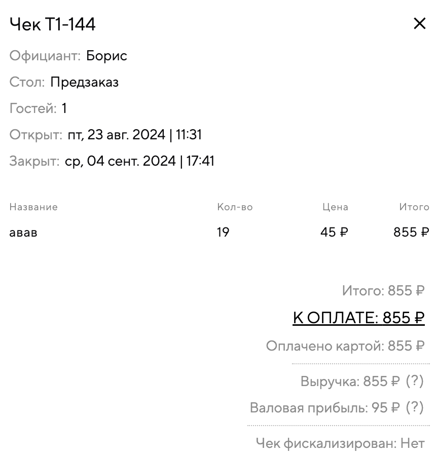 Нажмите на интересующий вас чек. Можно посмотреть дату открытия и закрытия чека, сотрудника, открывшего чек, количество гостей, применённые скидки и другие детали.
