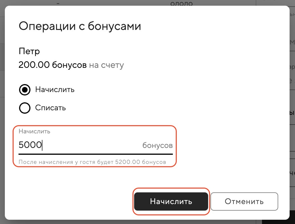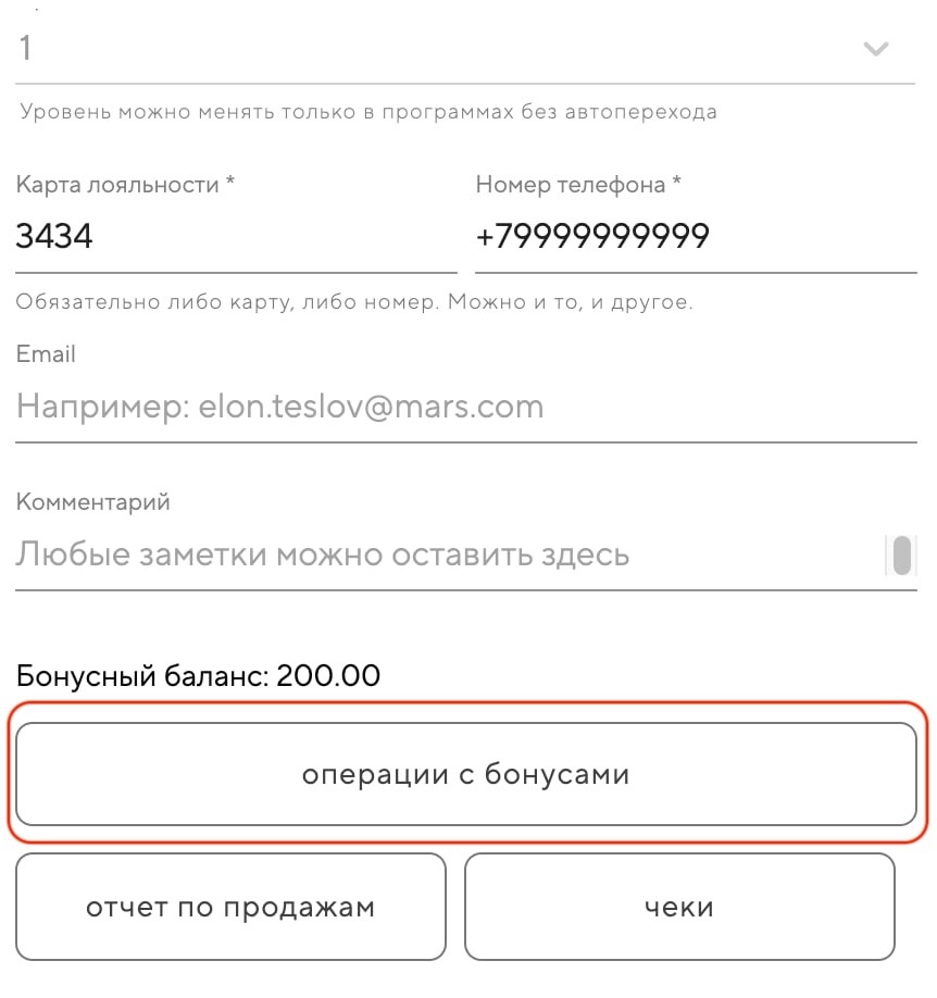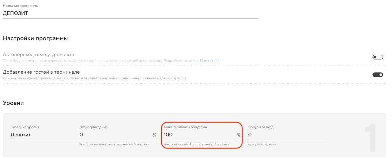 Обратите внимание, что созданная бонусная программа должна позволять списывать бонусы в размере 100% (настройка «максимальный % оплаты чека бонусами»), чтобы вы могли применить гостя к чеку и полностью использовать его бонусы. Пример, как это может выглядеть: