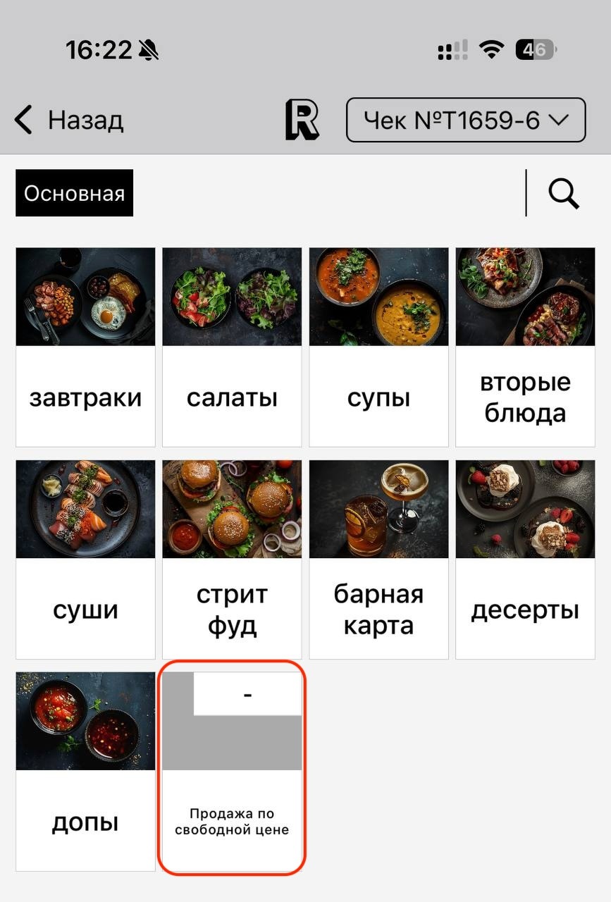 Вы открываете чек в приложении Restik POS и нажимаете кнопку «продажа по свободной цене»: