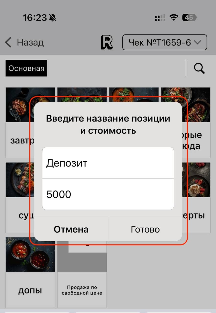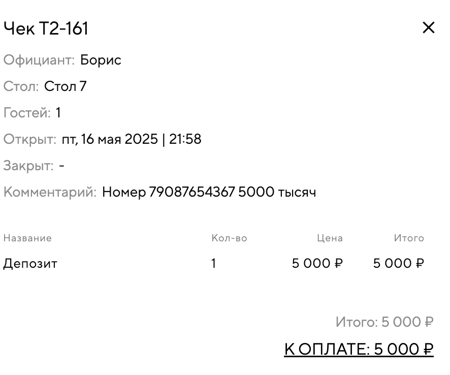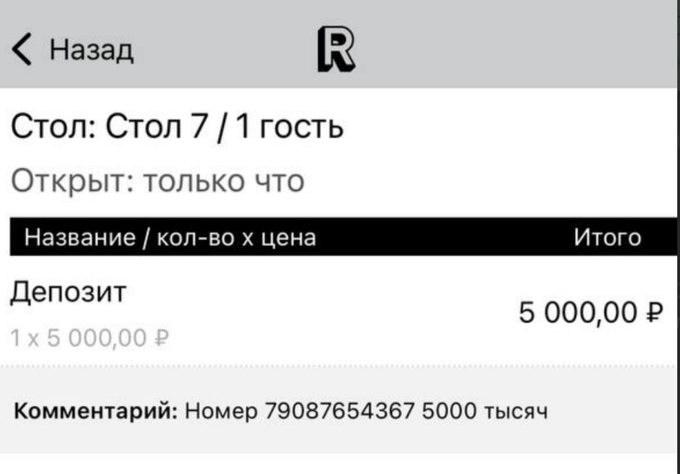 Все блюда и напитки, заказанные гостем, вносите в этот же чек. При расчёте обратите внимание на комментарий — так вы увидите, сколько средств гость внёс заранее. Если сумма чека превысит депозит, вы сможете уведомить гостя.