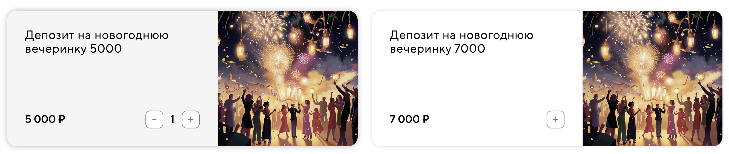Этот вариант подойдет вам, если вы не используете сайт доставки в классическом виде (например, только для курьерской доставки или самовывоза), можно настроить меню так, чтобы вместо блюд были позиции с разными суммами депозитов. Например, «Депозит на новогоднюю вечеринку 7000».