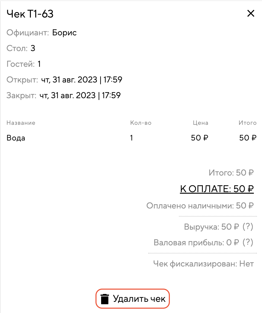 После этого удалить чек в разделе «Закрытые чеки» в админке или в приложении Restik Admin.