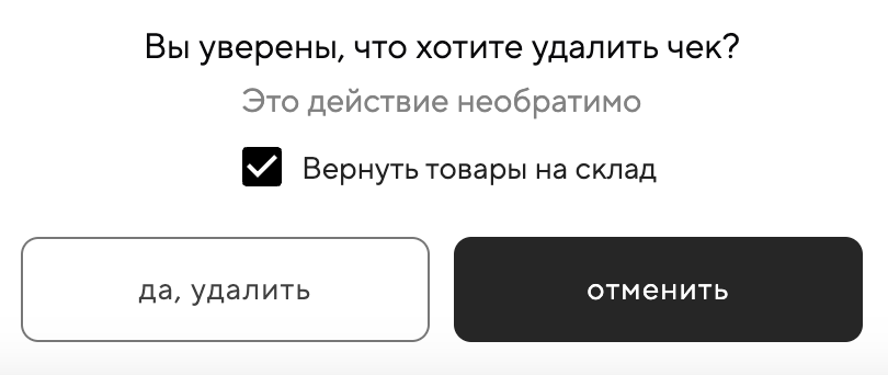 Выбрать нужно ли возвращать товары на склад. Система автоматически ставит галочку «Вернуть товары на склад», если в связи с этим чеком были списания со склада — её можете убрать, если необходимо. Например, если блюдо уже приготовили, а значит его составляющие не вернутся на склад. Такое блюдо можно списать, подробнее по ссылке;