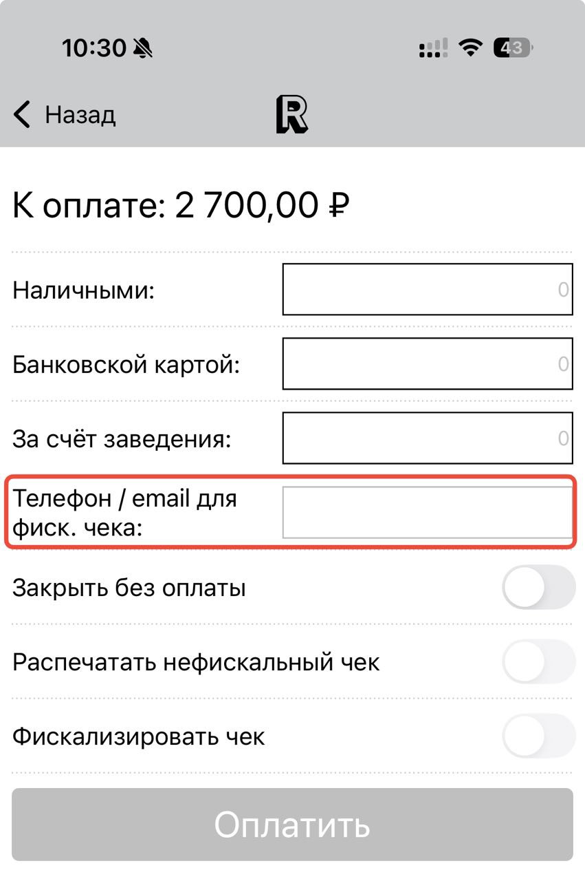 Если же номер телефона гостя или email не указан на экране оплаты — чек будет распечатан, так как по закону бизнес обязан выдавать бумажные чеки, в случае если они не отправлены электронным способом.