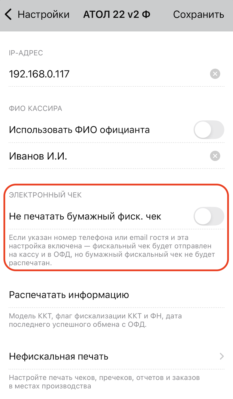 Как включить опцию «не печатать бумажный фискальный чек»