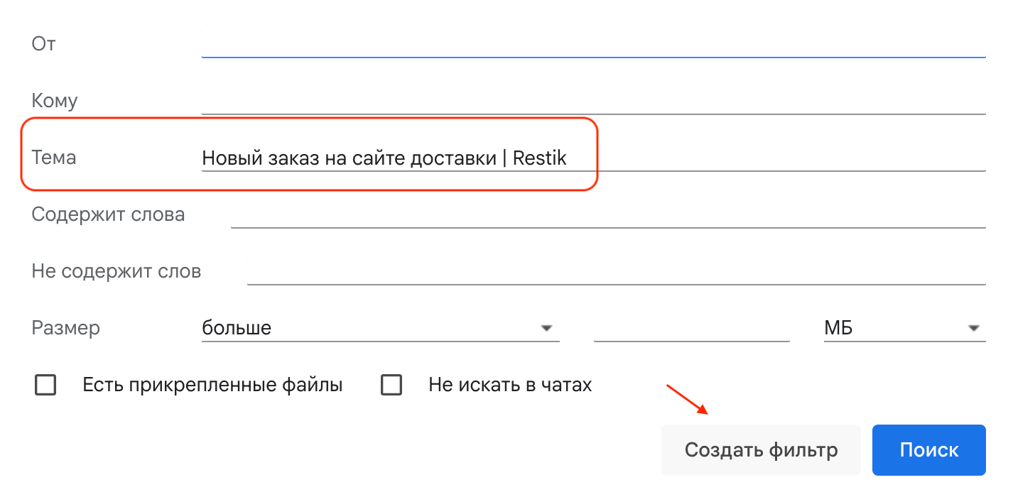 3. В поле «Тема» введите: Новый заказ на сайте доставки | Restik