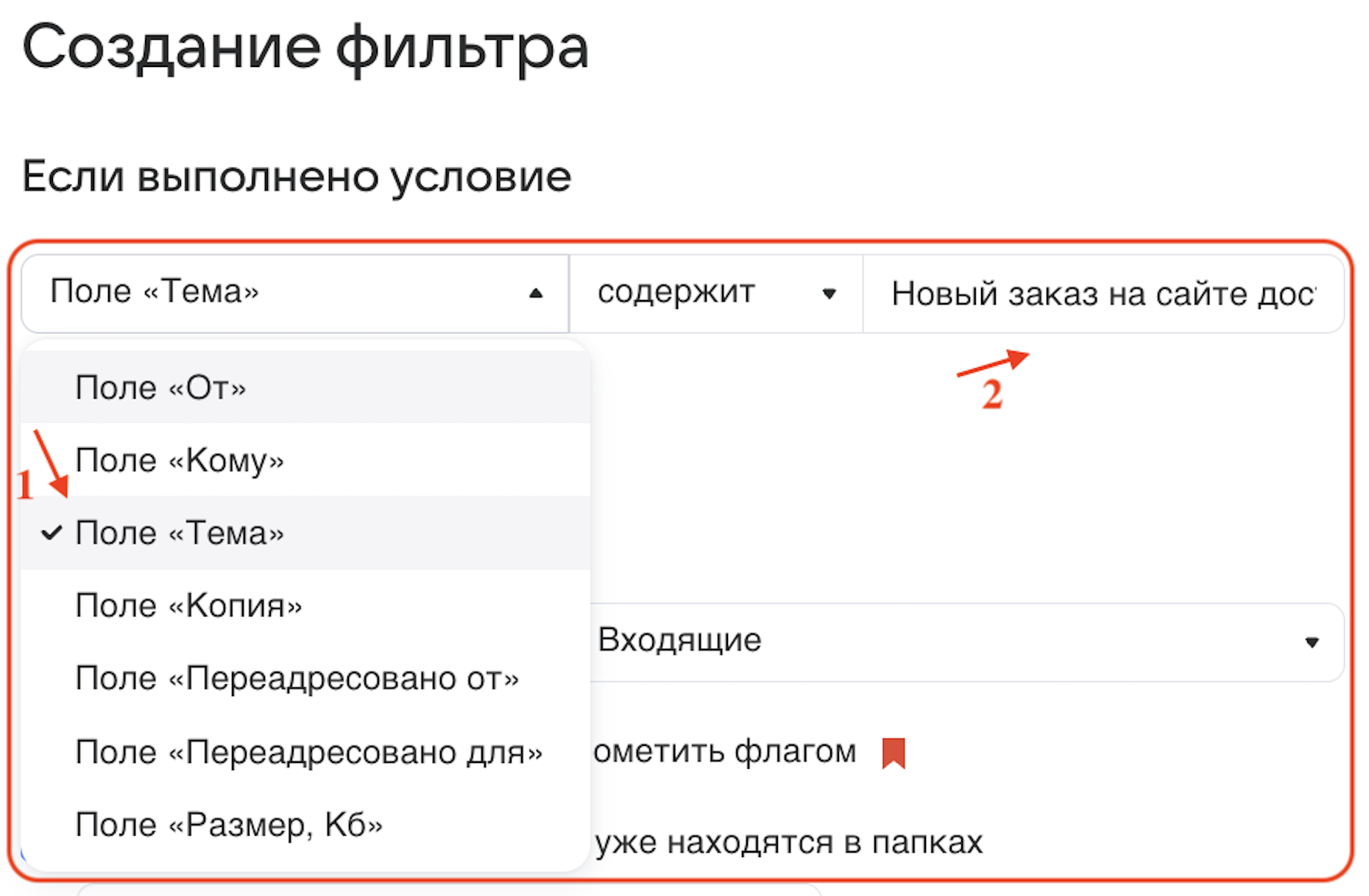 5. В поле «Если» выберите «Тема» и введите: Новый заказ на сайте доставки | Restik
