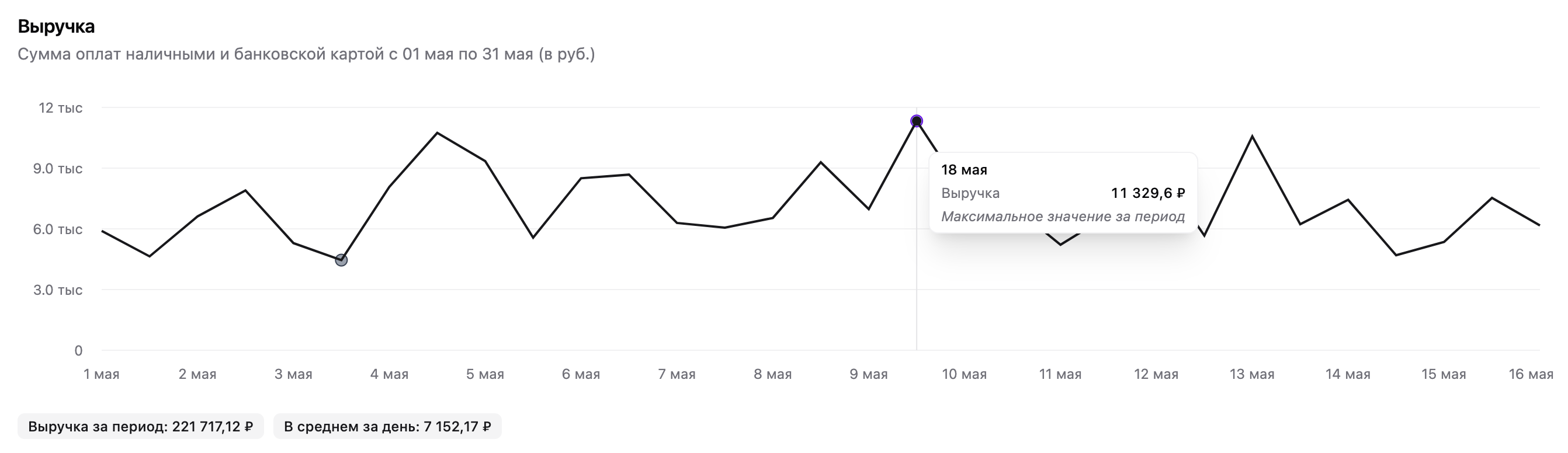 📈 Рассмотрим график за месяц и разбивку по дням на примере выручки, мы сможем посмотреть, в какие дни значение было больше всего. Также система выделяет день с самой высокой выручкой.