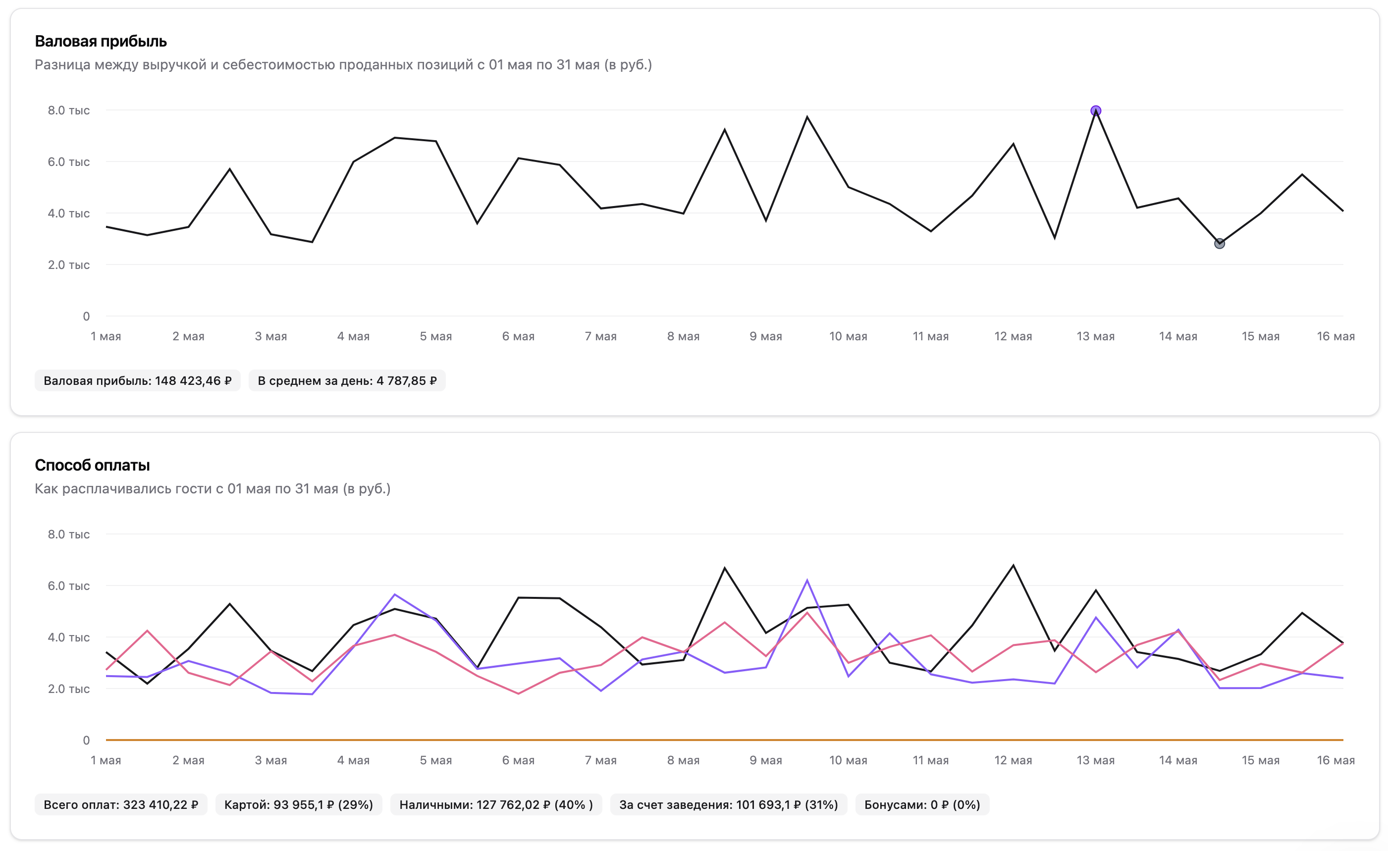 Сводка предоставляет информацию, с помощью которой вы можете управлять заведением — его выручкой, посещаемостью и другими показателями.