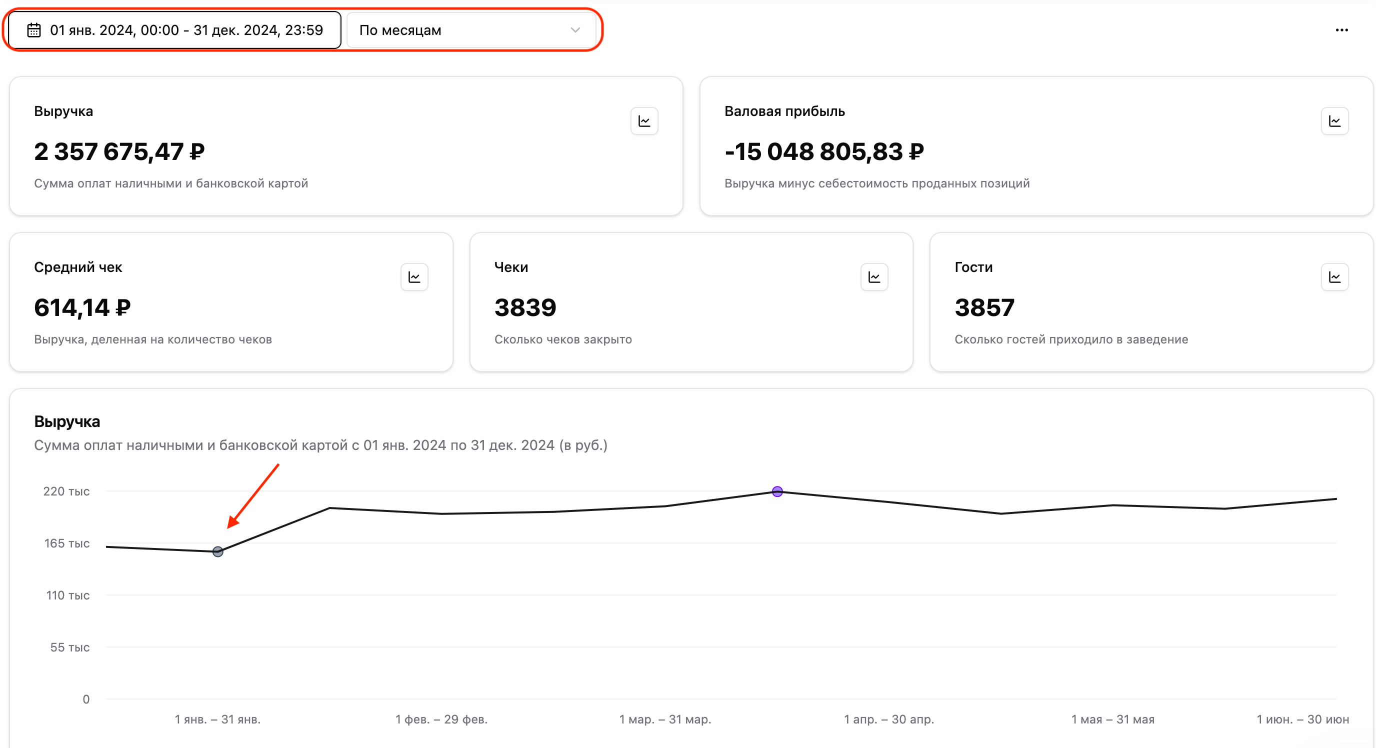 Фильтры позволяют быстро выбрать нужные данные для точного анализа и принятия решений: оценить динамику продаж и выявить часы пиковых продаж или средний чек. Возможности фильтрации зависят от выбранного периода.