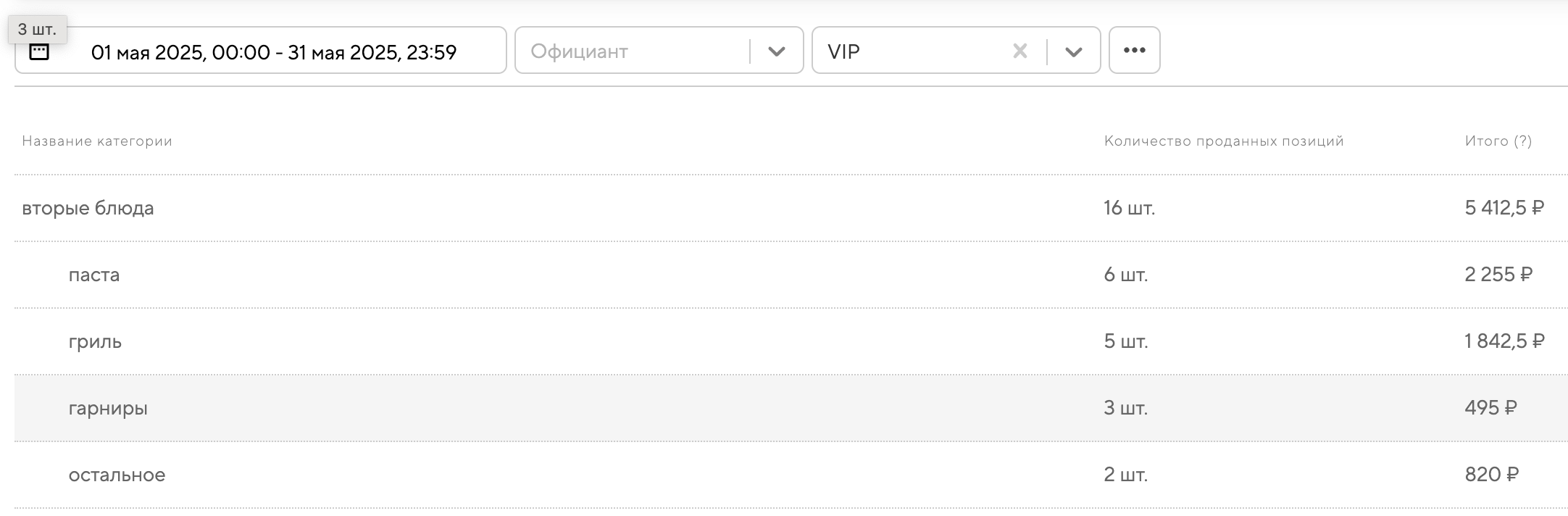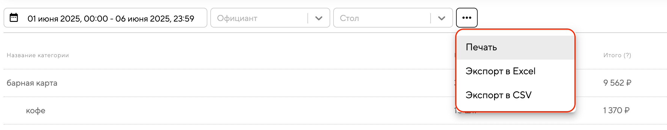 Используя фильтры по официантам и столам, можно оценить вклад каждого сотрудника и эффективность разных зон или каналов продаж. Эти данные помогают управлять меню более целенаправленно: усиливать популярные категории, оптимизировать ассортимент менее востребованных и улучшать работу команды. В итоге это способствует повышению продаж и общей эффективности заведения.