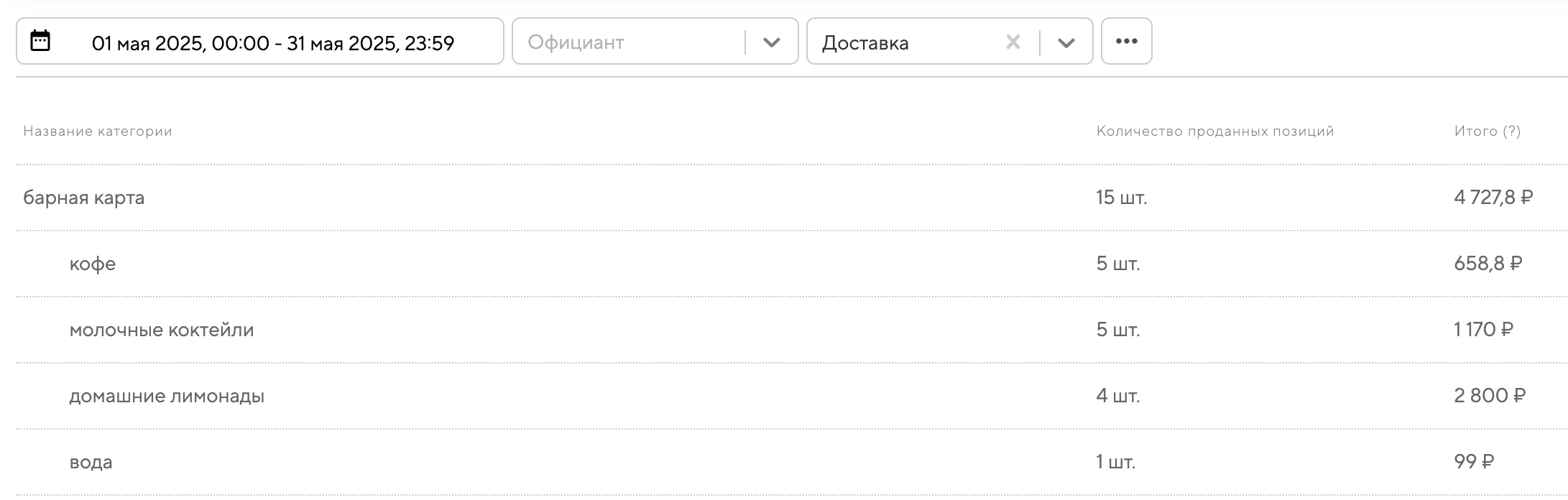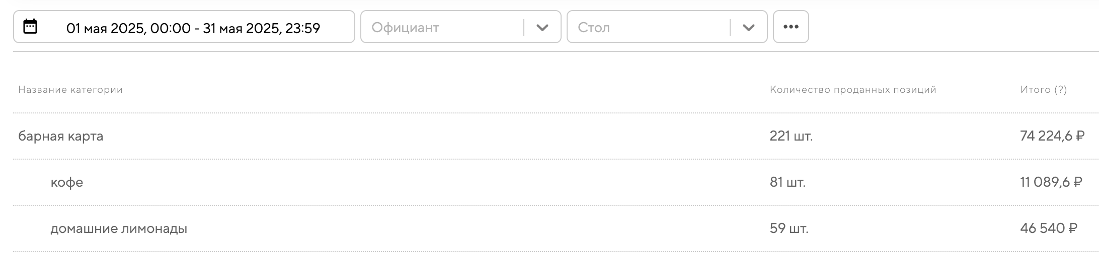 Название категории — это то название категории, которое вы ей задали. В отчёте также отображаются подкатегории, входящие в данную категорию. Например, категория «барная карта» может включать подкатегории «кофе», «молочные коктейли» и другие.