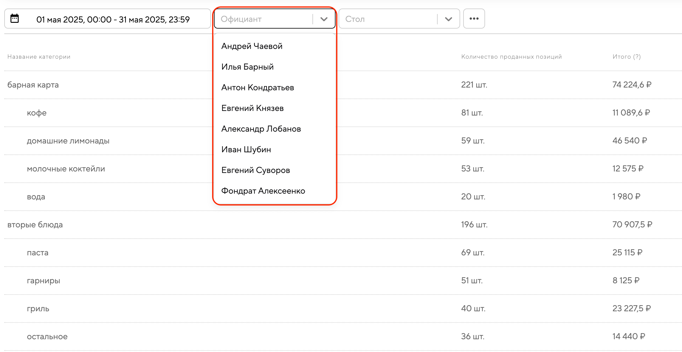 По официантам — смотрите, какие категории и в каком объёме продаёт каждый сотрудник.