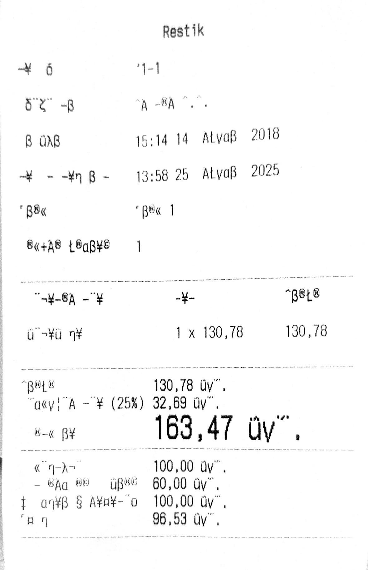 Если решения выше не помогли, вероятнее всего, принтер использует не ту кодировку, которую передаёт Restik, а свою дефолтную (по умолчанию). Если эта кодировка неверная, принтер будет печатать неправильно.