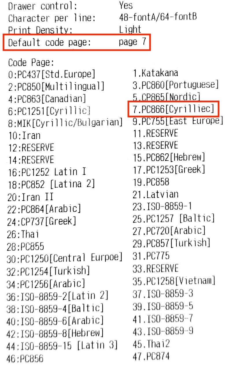 Правильной для работы с кириллицей всегда должна быть кодировка PC866 [Cyrillic], но на разных моделях принтеров ей может соответствовать разный порядковый номер. Обратите внимание, какой именно номер указан рядом с PC866 на вашем сервисном чеке — именно его нужно указать в настройках.