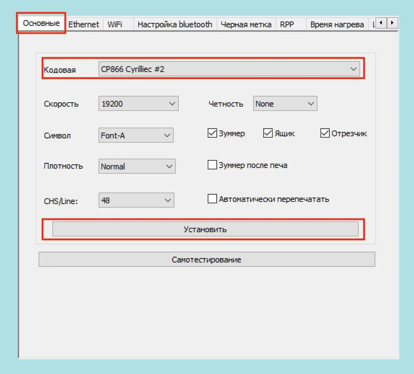 Правильной для работы с кириллицей всегда должна быть кодировка PC866 [Cyrillic], но на разных моделях принтеров ей может соответствовать разный порядковый номер. Обратите внимание, какой именно номер указан рядом с PC866 на вашем сервисном чеке — именно его нужно указать в настройках.