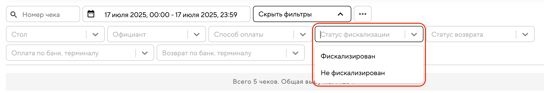 Выберите статус фискализации «Не фискализирован». «Не фискализирован» — это чек, который не был передан в налоговую. «Фискализирован» — это чек, который успешно отправлен в налоговую службу.