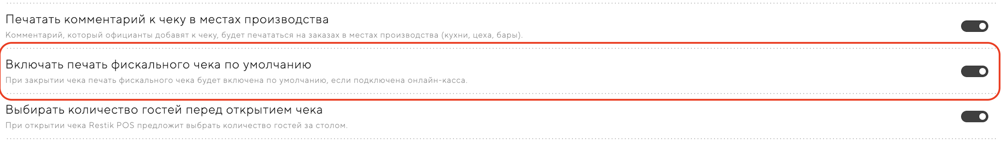 Чеки не фискализируются в приложении Restik POS. Не включена печать фискального чека по умолчанию, либо тумблер печати отключен в момент пробития чека.