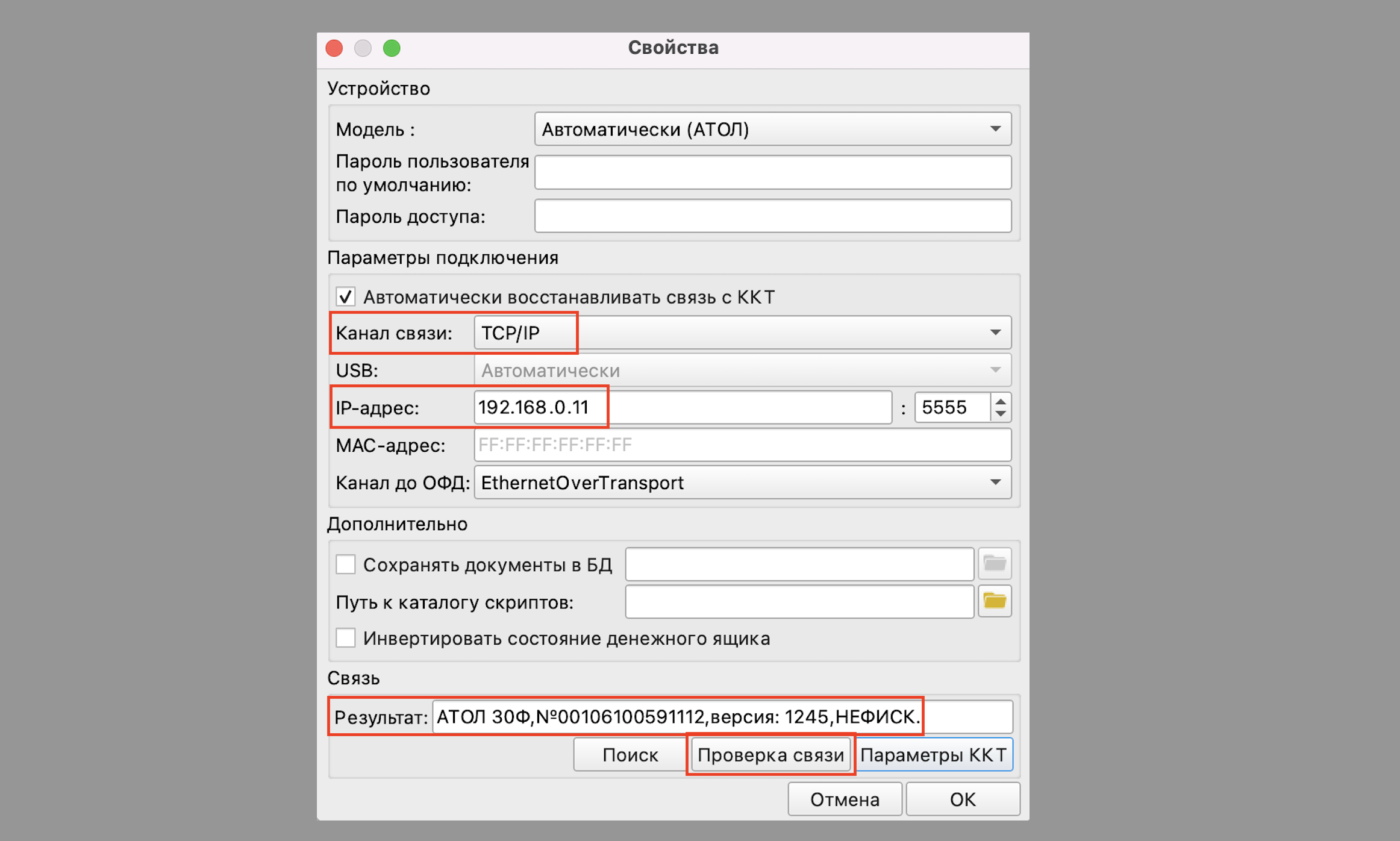 Если касса настроена на работу в сети, то в окне «Свойства» выберите канал связи «TCP/IP». Введите IP-адрес вашей кассы, который она печатает при включении, в поле «IP-адрес».